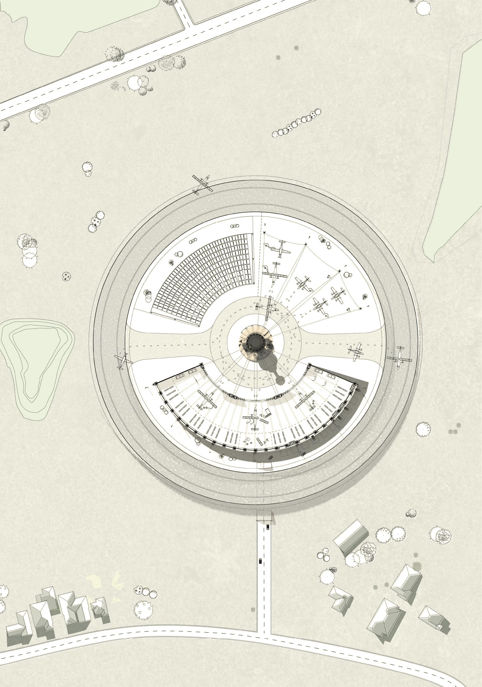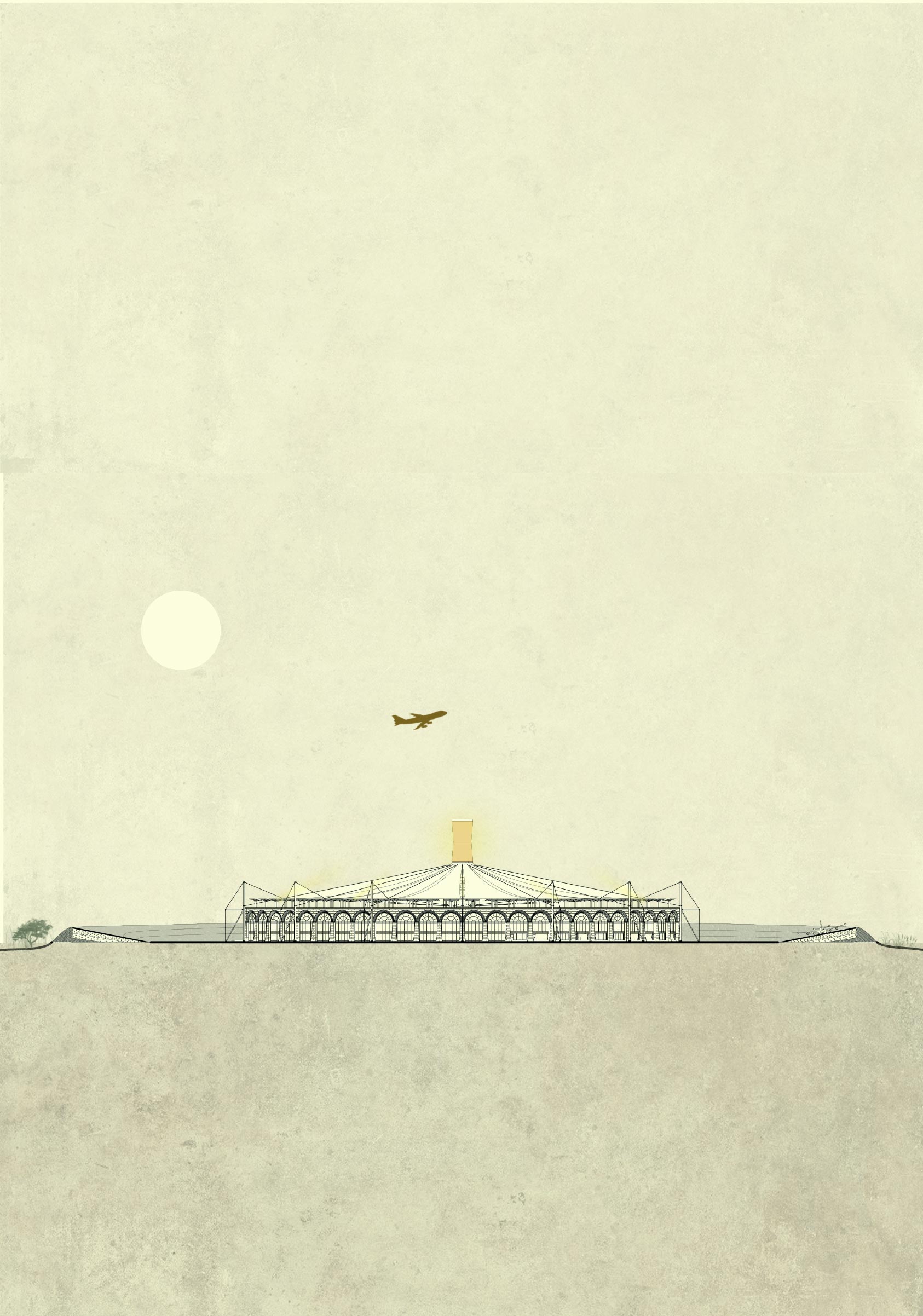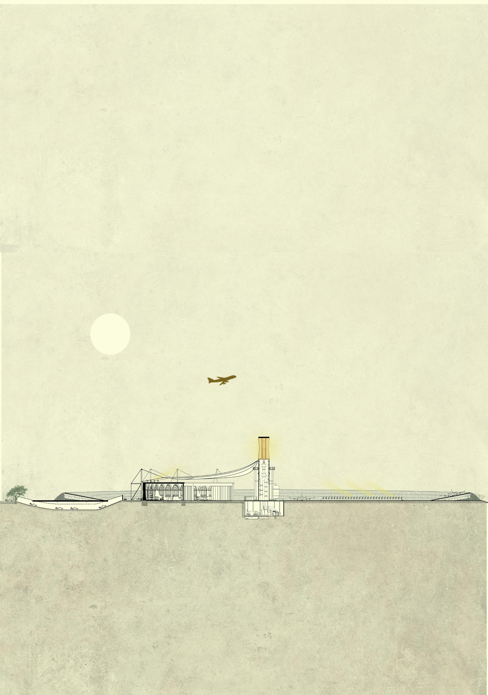 This hangar provides charging stations to allow multiple experimental flight runs. It has a circular structure to accommodate the heliostats rows around the central receiver tower, which generates power; and two storage tanks, which is used to produce steam and would ideally generate 36,000 kw per day of electricity. It can power a 4-9 seater hybrid-electric aircraft for up to 100 hours of flight by year 2025.