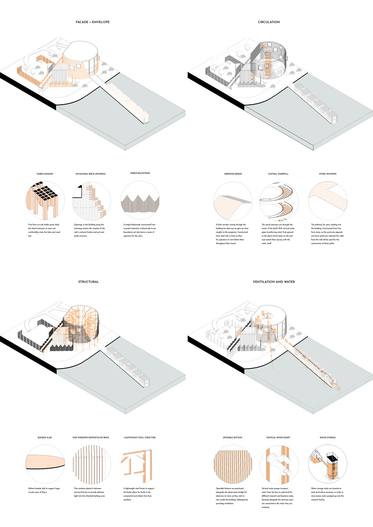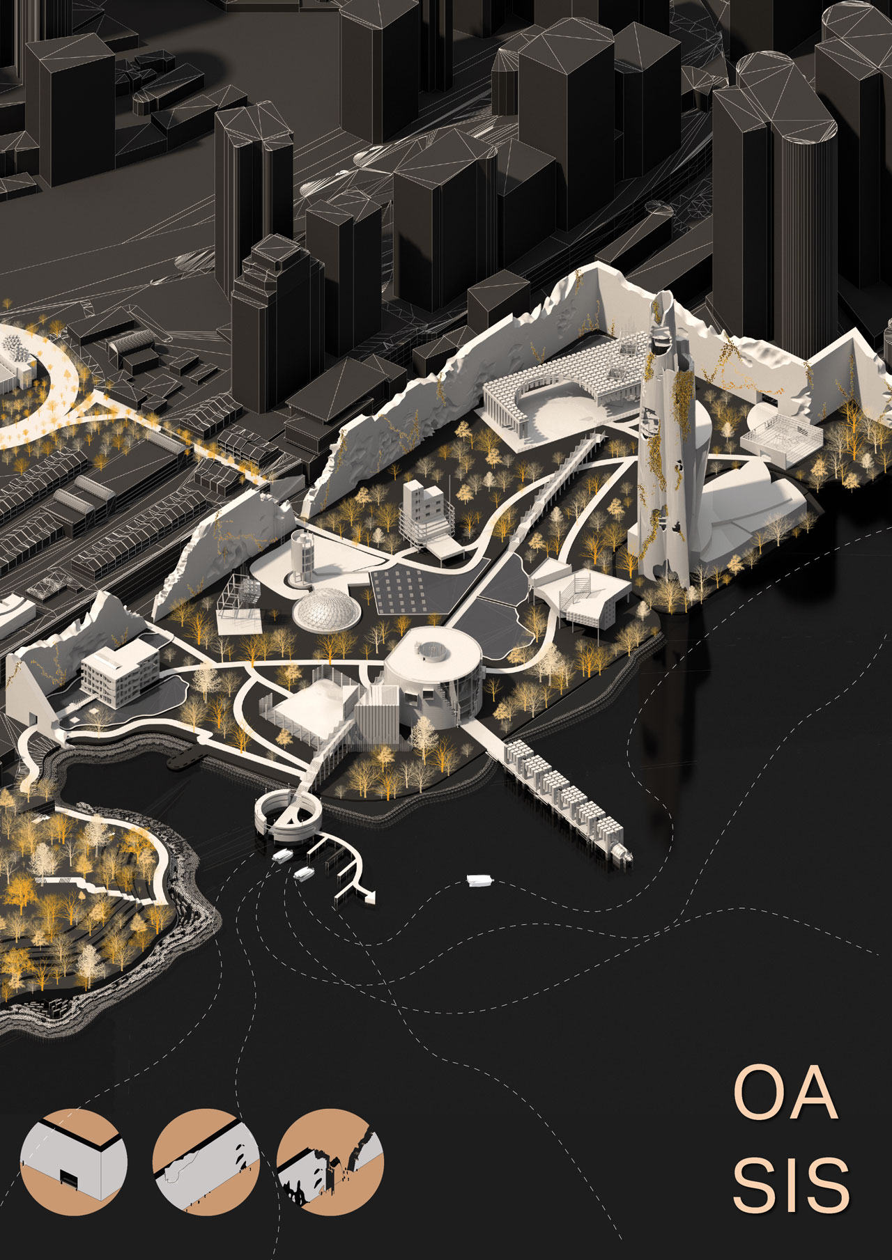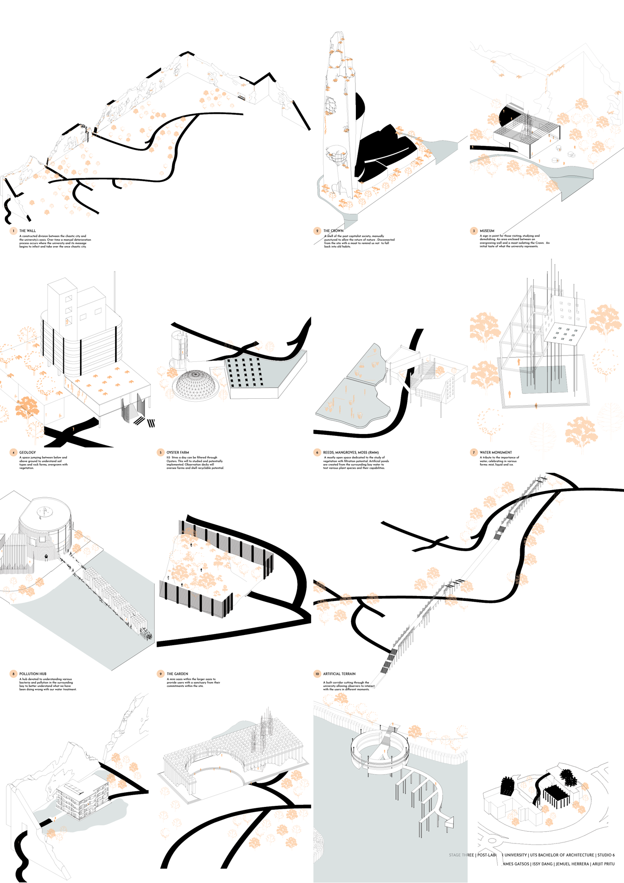 Users are given an opportunity to visit the university as their learning requires or to live on the site to understand long term effects of the filtration process. Each island in an archipelago site will research and teach its own process, from oyster farms to mangrove and reed farms students will have a practical and hands on approach on how to restore our forgotten water. The public is invited to the parent site to demolish the wall and to interact and engage through a built corridor acting as an artificial terrain, cutting through the site.