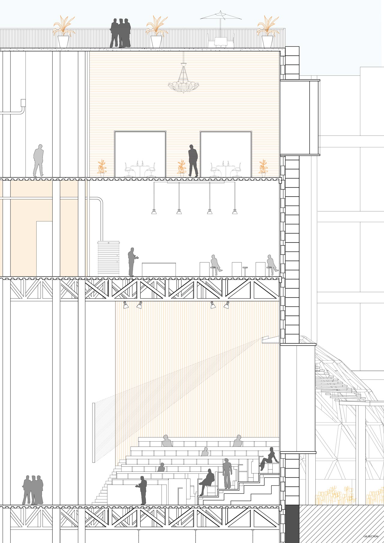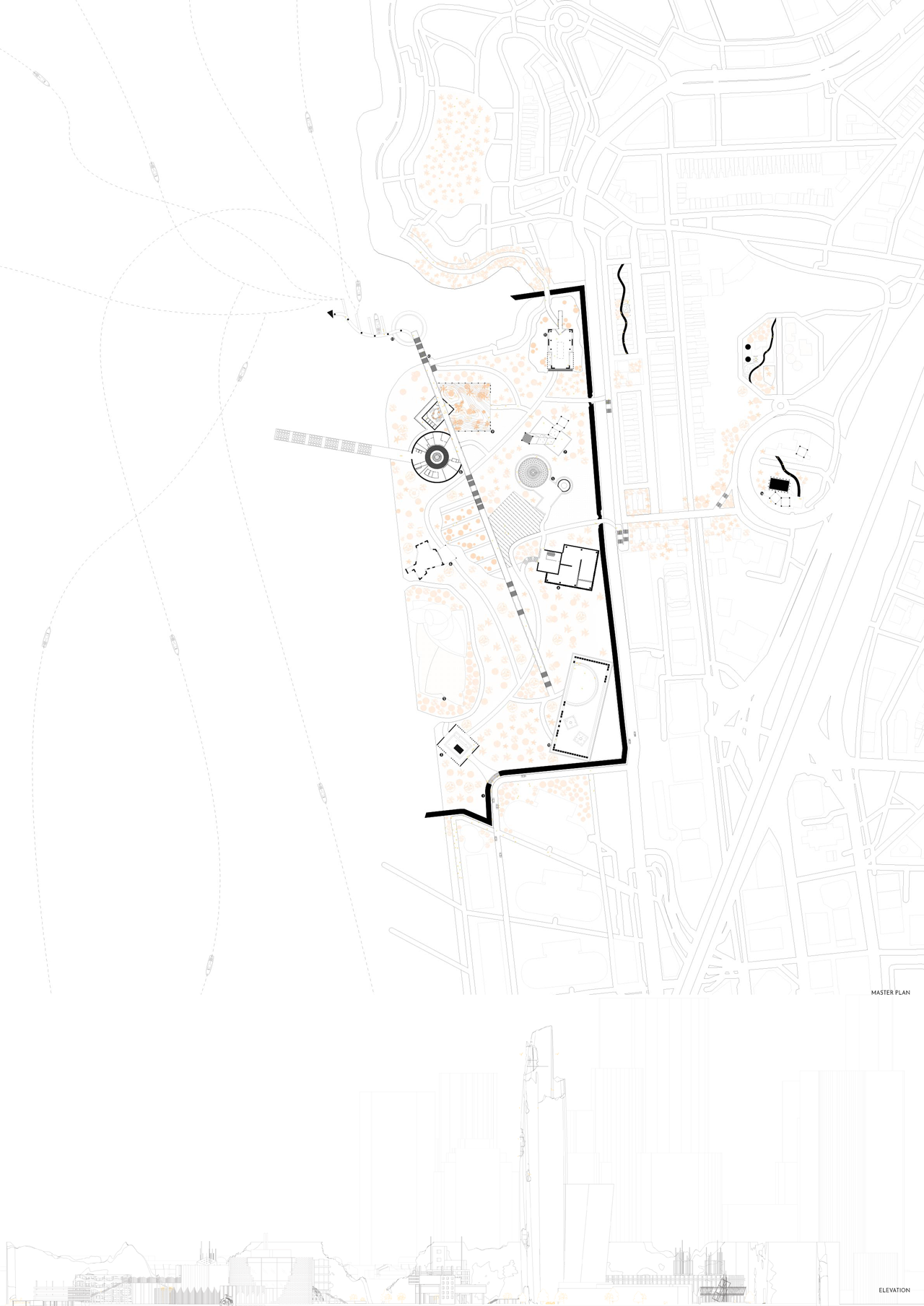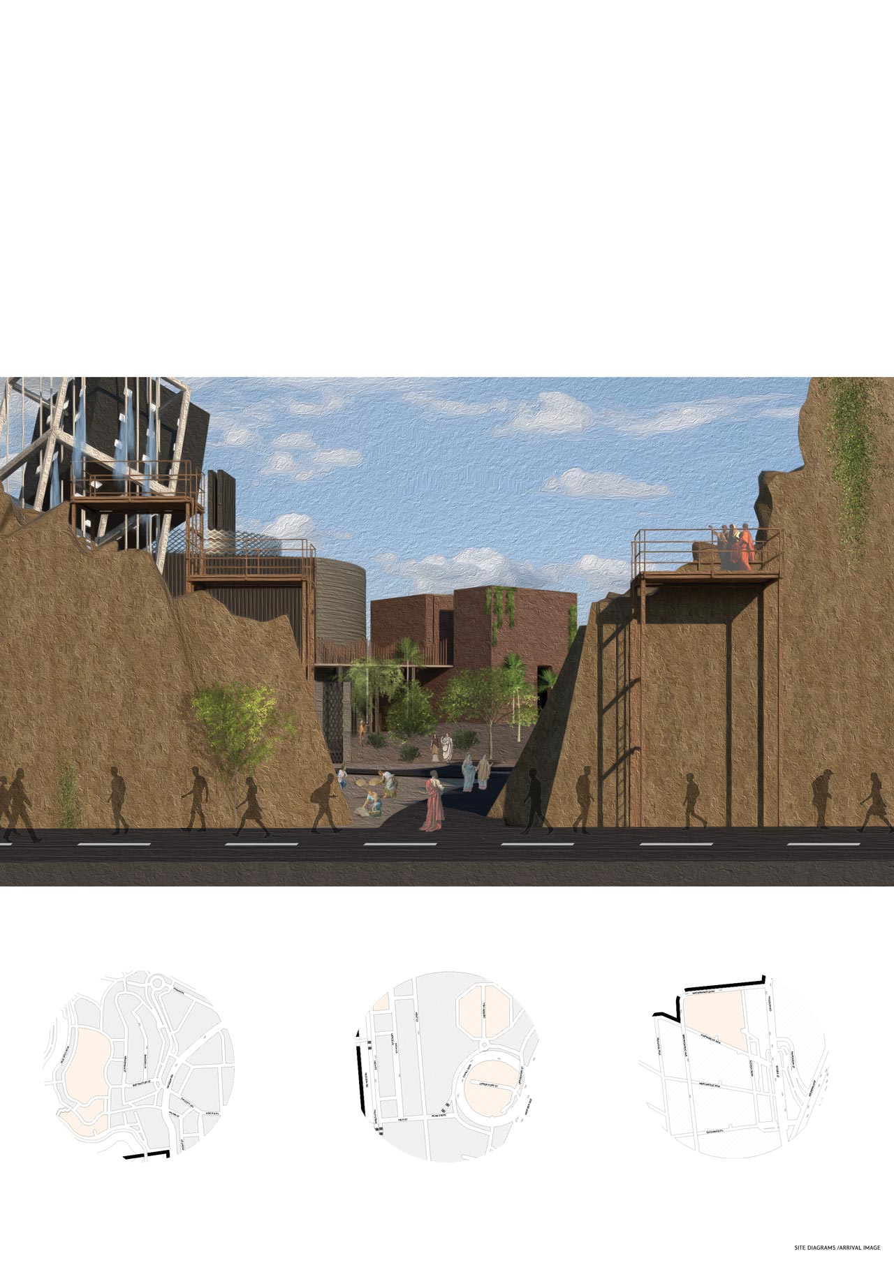 The site, located in Barangaroo, will be enclosed from the city with a large sandstone wall forming an oasis from the chaotic cityscape. The wall, constructed at first with intentional cracks and openings will begin to be further demolished by visitors to the site in order to infect the city with the universities message and way of life forward.